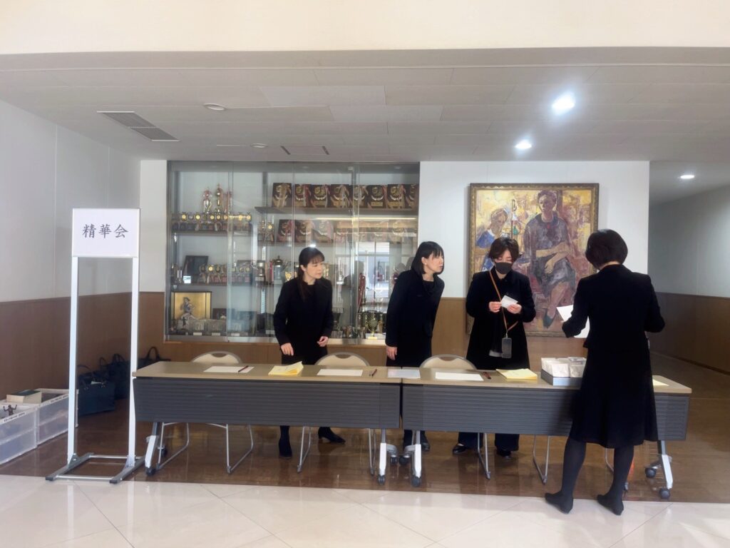 芳名帳にご記入いただいた後、式次第と精華会からの飴をお渡しして、控室までご案内。