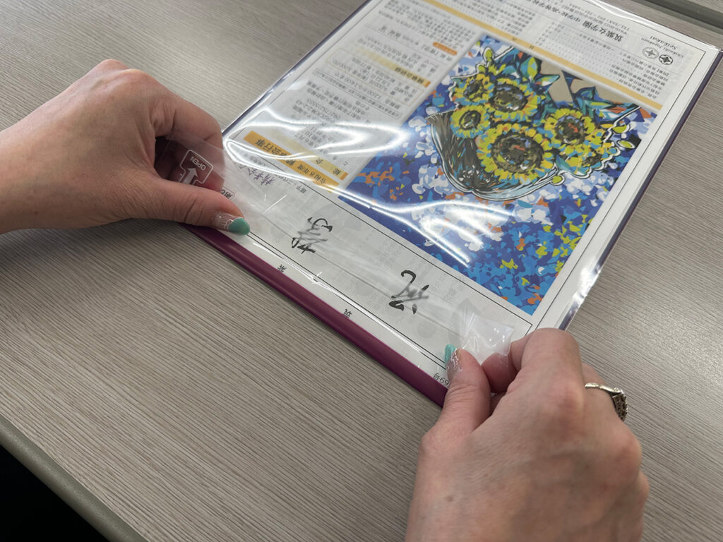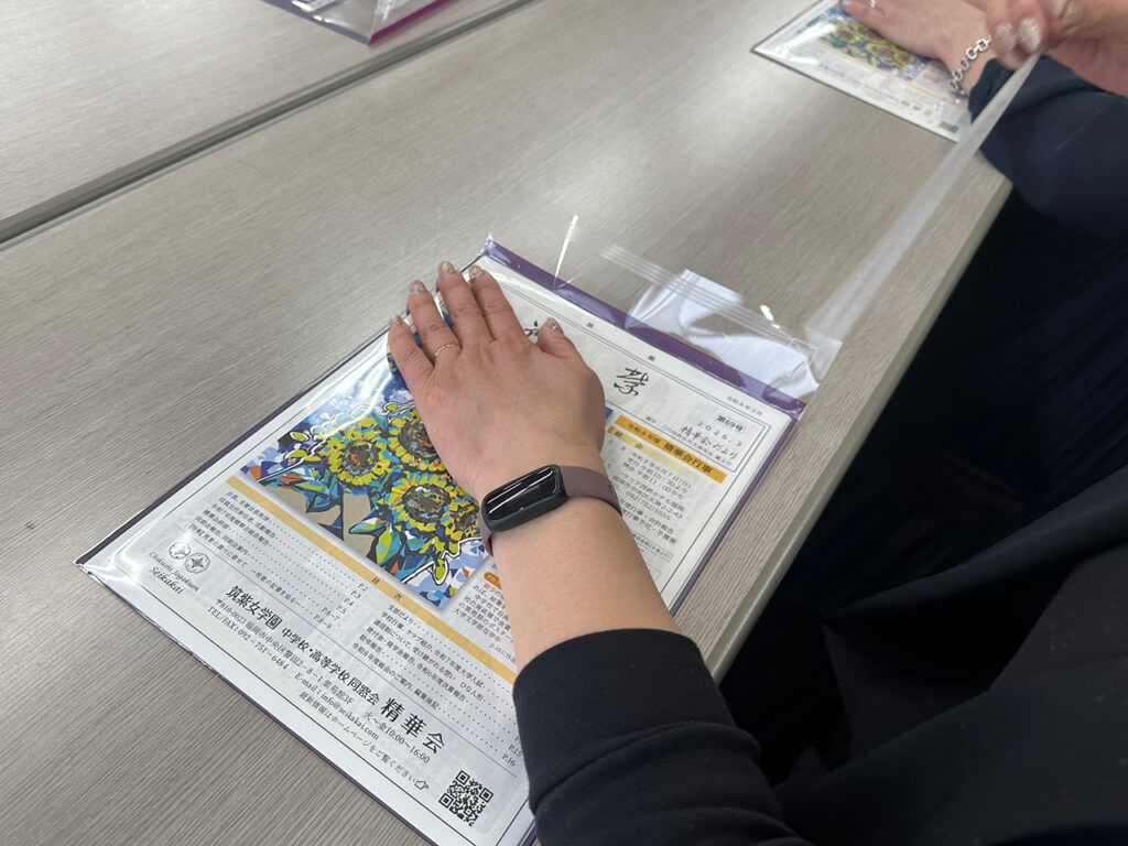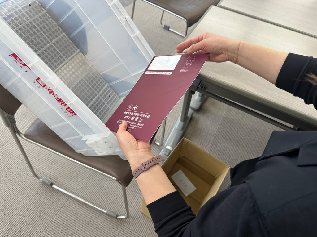 裏返しにした透明の封筒に、会報の表紙が見えるように入れます。